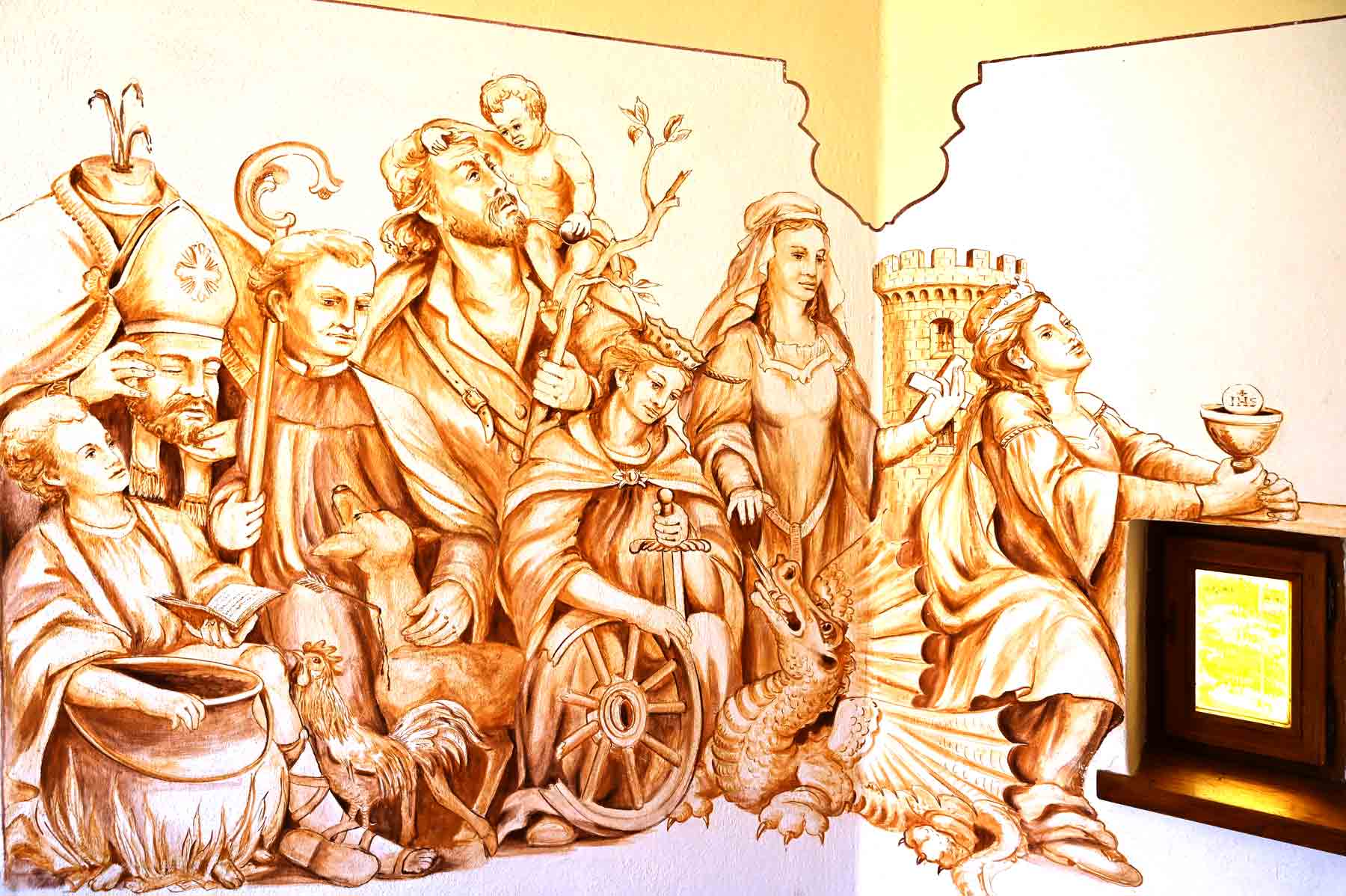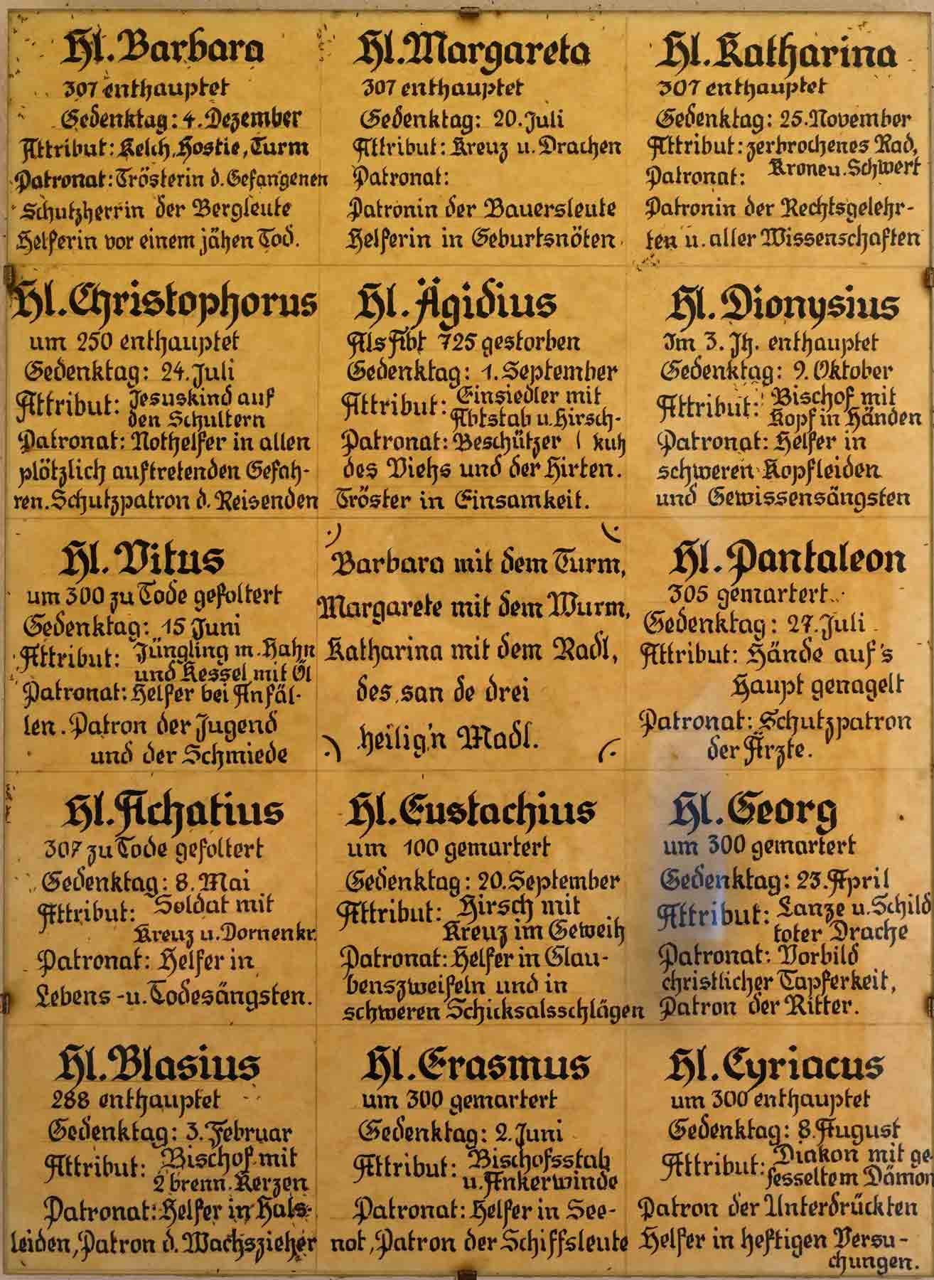 Beim Betreten der Kapelle wird man sofort von einer warmen, einladenden Atmosphäre umhüllt. Das Licht, das sanft durch die Fenster strömt, beleuchtet die kunstvoll gestalteten Darstellungen der 14 Heiligen Nothelfer, die an den Wänden verewigt sind. Jeder dieser Heiligen hat seine eigene Geschichte und Bedeutung, die den Gläubigen Trost und Hoffnung spenden.