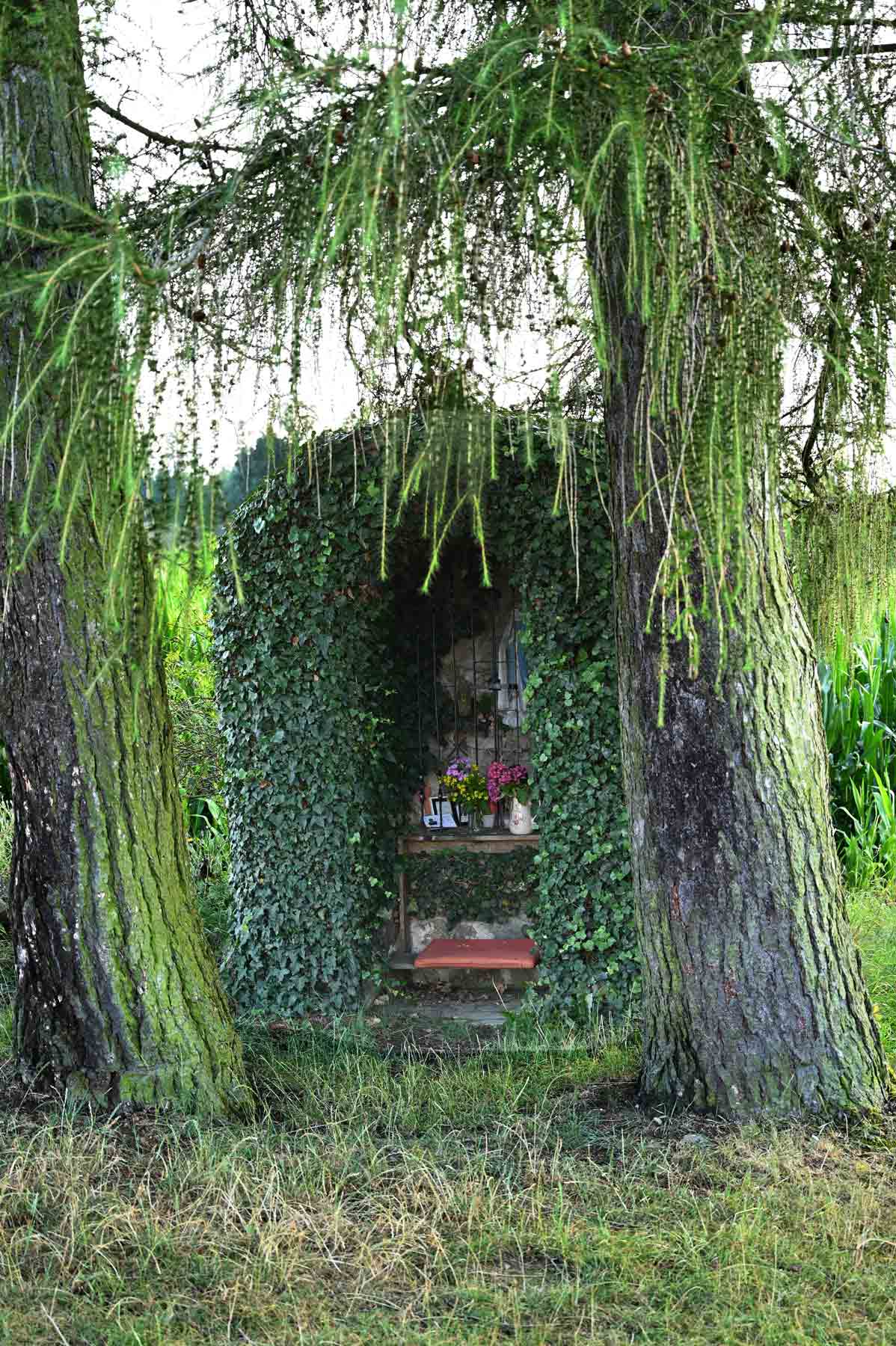 Inmitten der sanften Hügel des malerischen VIAVOVA Pilgerwegs, wo die Natur in ihrer reinsten Form erstrahlt, erhebt sich eine kleine Privatkapelle auf einer sanften Anhöhe. Diese bescheidene Kapelle, umgeben von üppigem Efeu, scheint wie ein gut gehütetes Geheimnis der Landschaft zu sein. Ihre Mauern sind aus warmem Stein erbaut, der im Licht der untergehenden Sonne golden schimmert und die Seele des Ortes widerspiegelt.