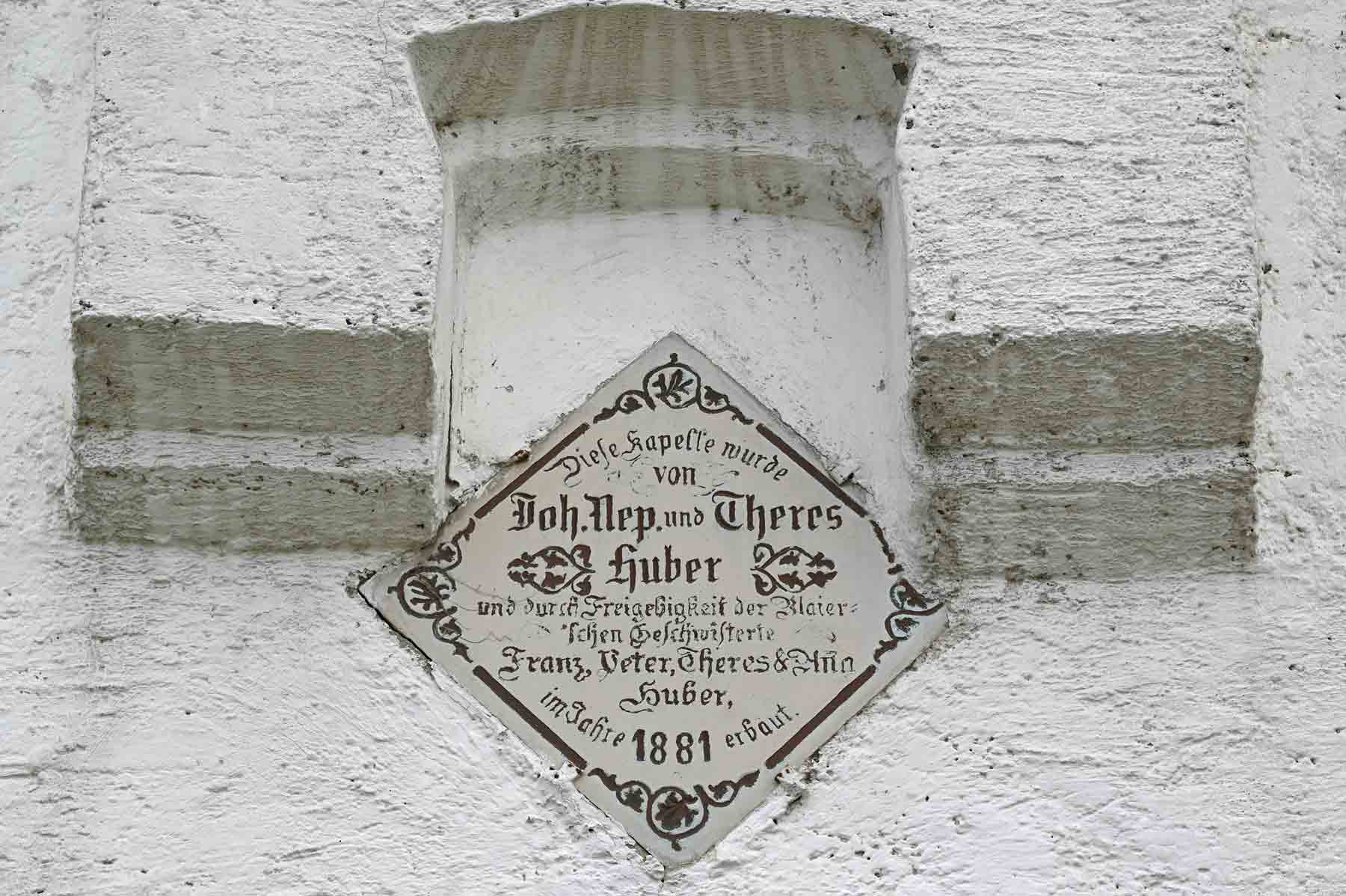 Die Kapelle, erbaut im Jahr 1881 von Johann Nepomuk und Theres Huber mit Unterstützung ihrer Geschwister Franz, Peter, Theres und Ana Huber, ist ein bedeutendes religiöses Bauwerk in der Region. Es wird angenommen, dass die Kapelle errichtet wurde, um den gläubigen Anwohnern den beschwerlichen Weg zur nächsten Kirche zu ersparen und ihnen einen Ort der Einkehr und des Gebets in ihrer unmittelbaren Umgebung zu bieten.