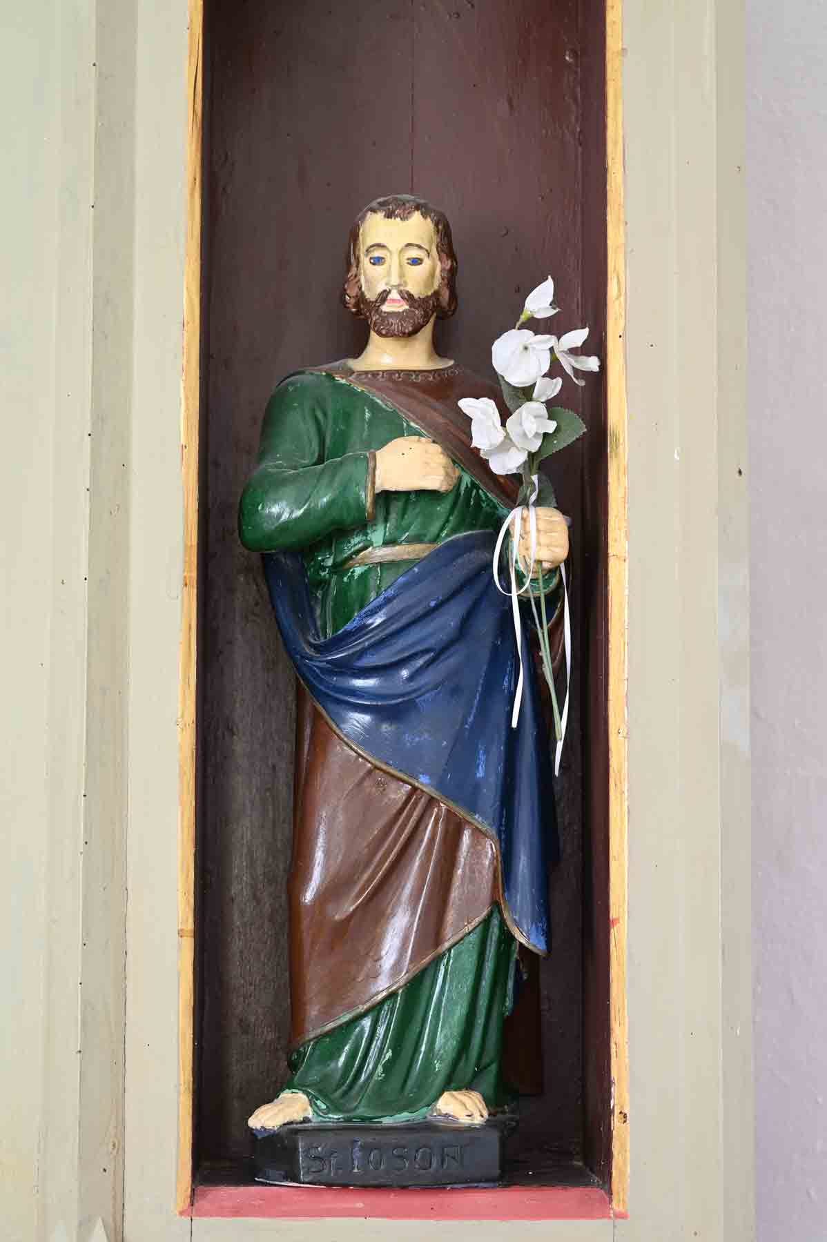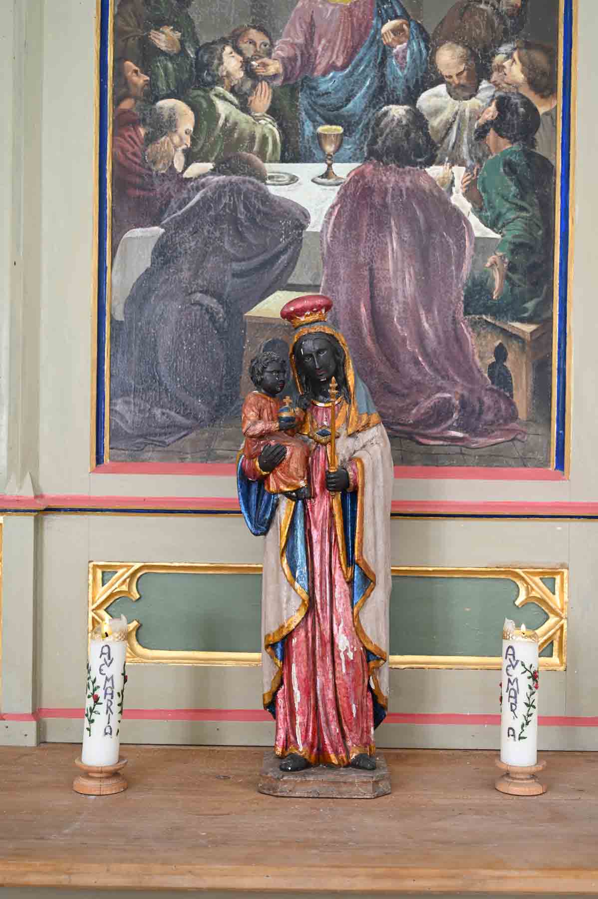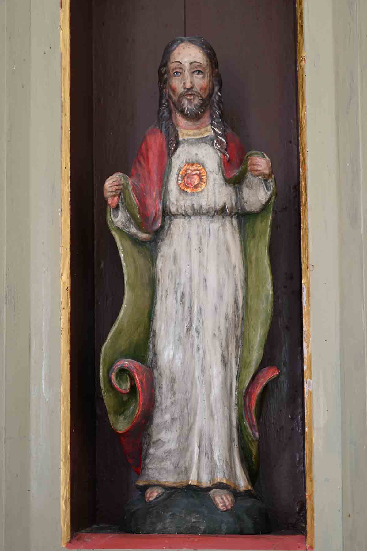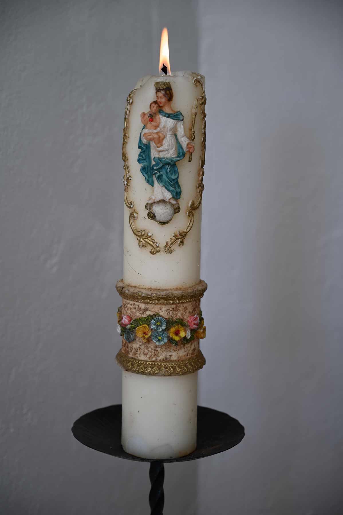 Es ist seinerzeit auch ein Kruzifix verschwunden, das Jesus ohne Dornenkrone zeigt. Leider ist es nicht mehr wieder aufgetaucht. Die Kerze auf der linken Seite hat ihren Weg in diese Kapelle gefunden, weil sie ein Pfarrer nicht in seiner Kirche haben wollte. Da die Spenderin leider schon vertorben ist hat diese schöne Kerze in dieser Kapelle ihren Ehrenplatz bekommen.